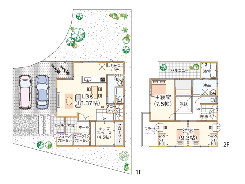 キッチン上は吹き抜けになっています。吹き抜けをつくることで2 F から降り注ぐ日差しが明るいリビングを演出します。