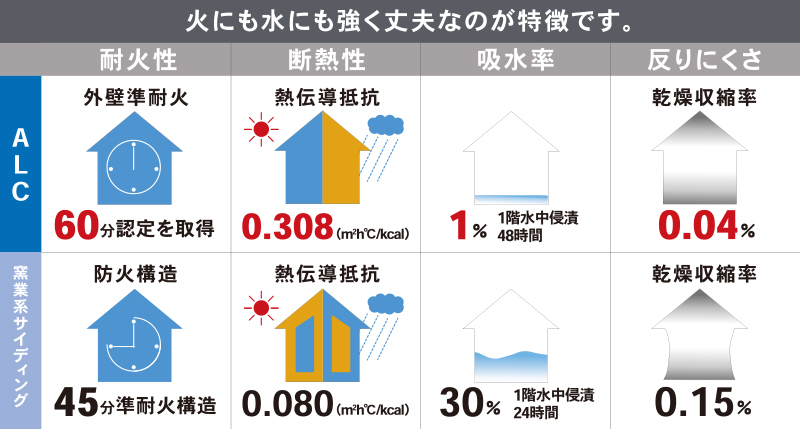 コンクリートは火や熱に強い外壁材です。しかも、ALCは珪石などの無機質でできているので、万一熱や炎を受けても発火することはありません。煙や有毒ガスが発生することもないので安心です。