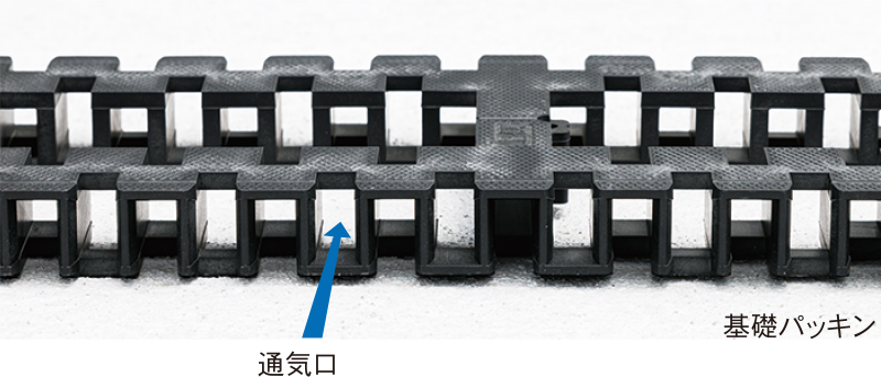 当社では基礎パッキン工法を採用しています。基礎パッキン工法を採用するにあたってのメリットは、基礎と土台の外周部に換気が取れる点・基礎に換気口を開ける必要がないため、コンクリートの強度が保ちやすい点・換気口から害獣が入りにくいことです。基礎パッキンとは、基礎のコンクリート部分と土台の木部の間に入る硬い樹脂製のものをいいます。使用しているロングタイプの基礎パッキンには換気スリットがあり、それが防鼠材の役割を果たしています。床下全体を囲うように設置するため通気性が高く、基礎に穴を開ける必要もないため、基礎の強度を強く保つことができます。