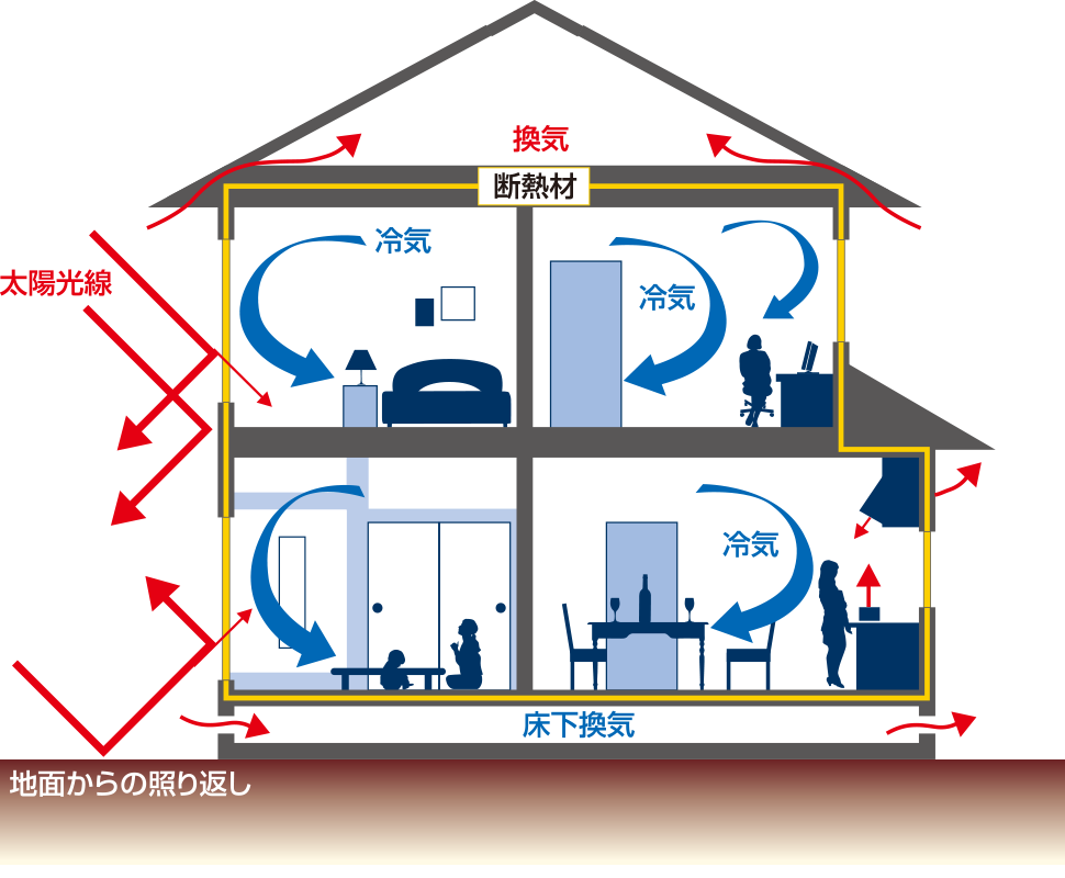 夏は日射しにより加熱された壁の中の熱気が排出され、室内の温度上昇が抑えられるので冷房効果が高まります。