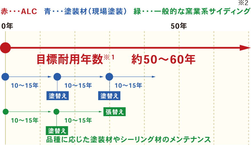 - ※1目標耐用年数とは、塗装材などの適切なメンテナンスをもとに張替え不要と推定される年数で、保証値ではありません。