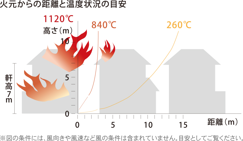隣家が火災時には、外壁面は800℃以上の高熱にさらされることになります。木材の引火危険温度は約260℃であるため、外壁の内側がその温度に達すると構造体が発火する恐れがあります。パワーボードの場合は外壁が直接炎にさらされても、内側は引火危険温度まで上がりにくく、延焼の危険性を減らすことができます。