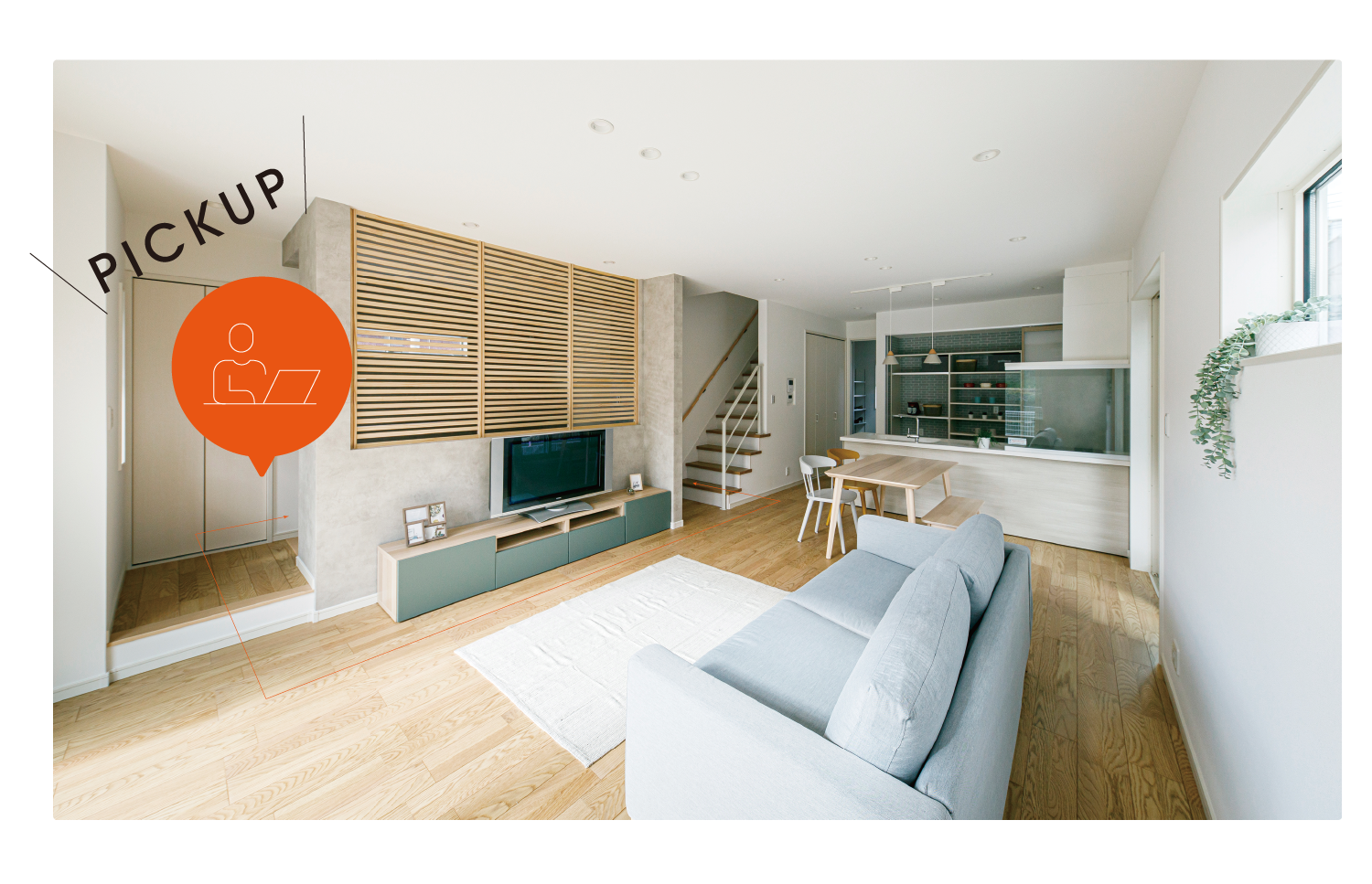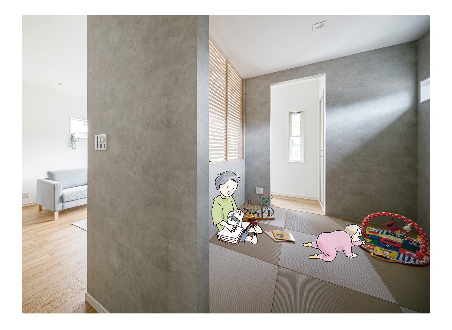 リビングに配置されたTVボードの裏側に目隠し和室コーナーをご用意。視線が遮られるので集中したいご家族向けのプランニング。和室にするポイントは、利用シーンの豊富さにあります。集中して仕事をこなすだけではなく、子どもたちのプレイルームや、洗濯物の避難場所、急な来客の寝室など、様々な状況にも対応。