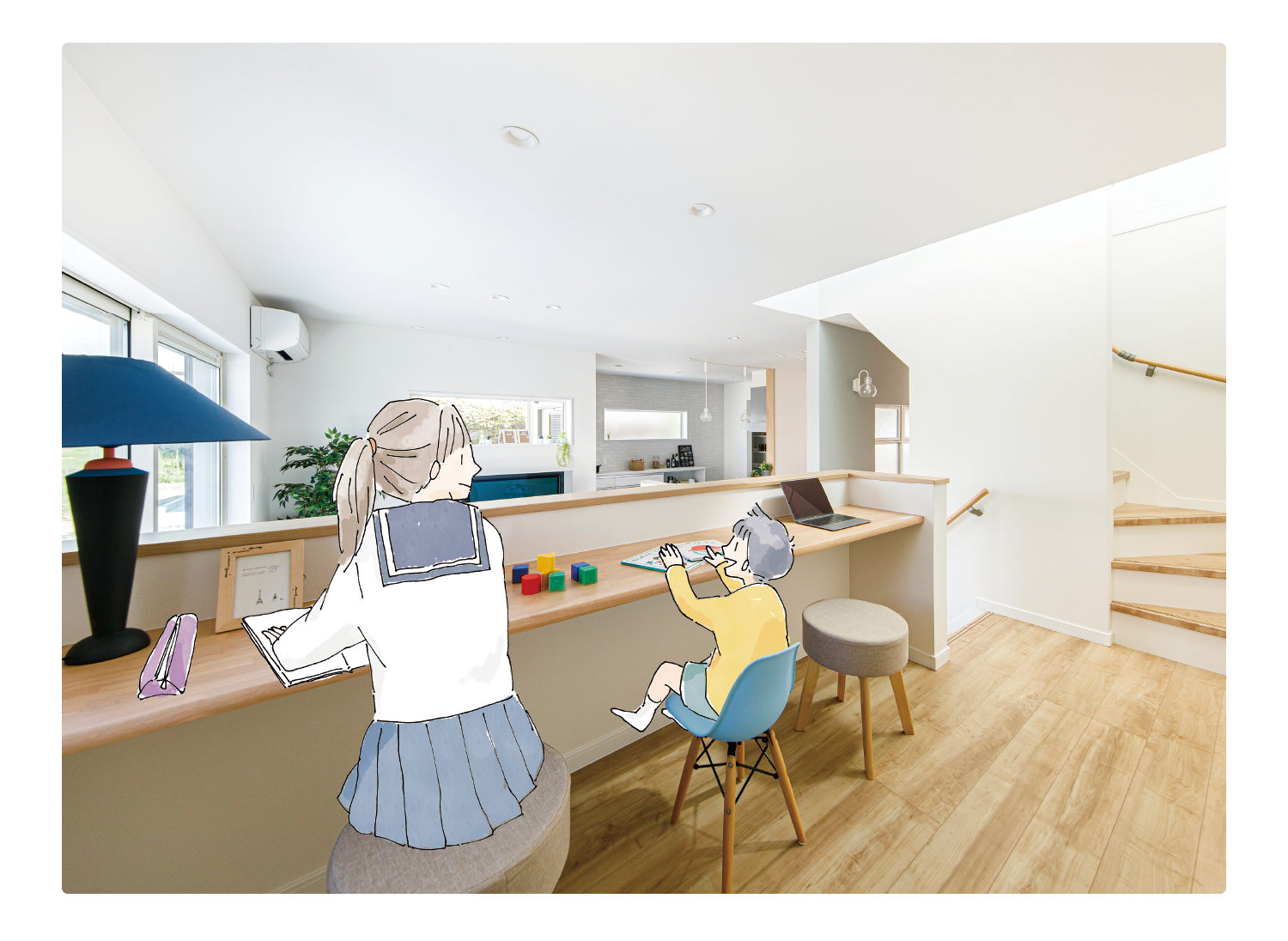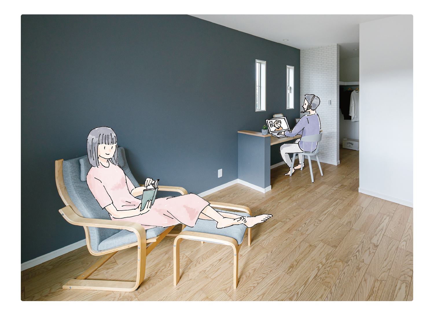 リモートワークまでいかなくとも自宅で仕事をこなす機会が多いご家族様に。ポイントは仕事量・利用時間帯・家族との距離感・使用者など、ご家族の生活スタイルに合わせた多彩なプラニングが可能です。