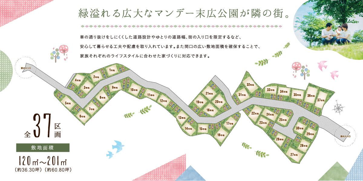 緑溢れる広大な末広公園が隣の街。新しい分譲地は同世代が集まりやすいことが特徴なので、
